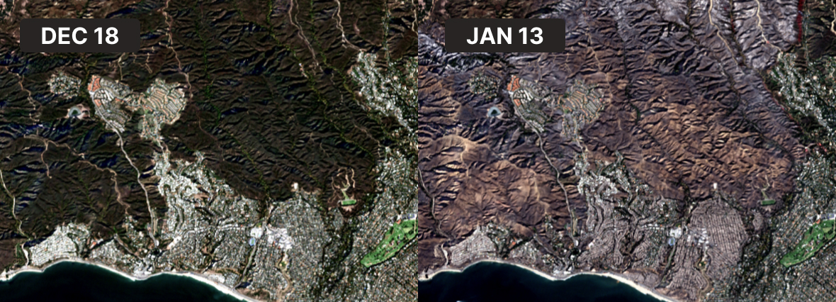 Figure. Sentinel-2 satellite images depicting the Pacific Palisades region before and after fire start.